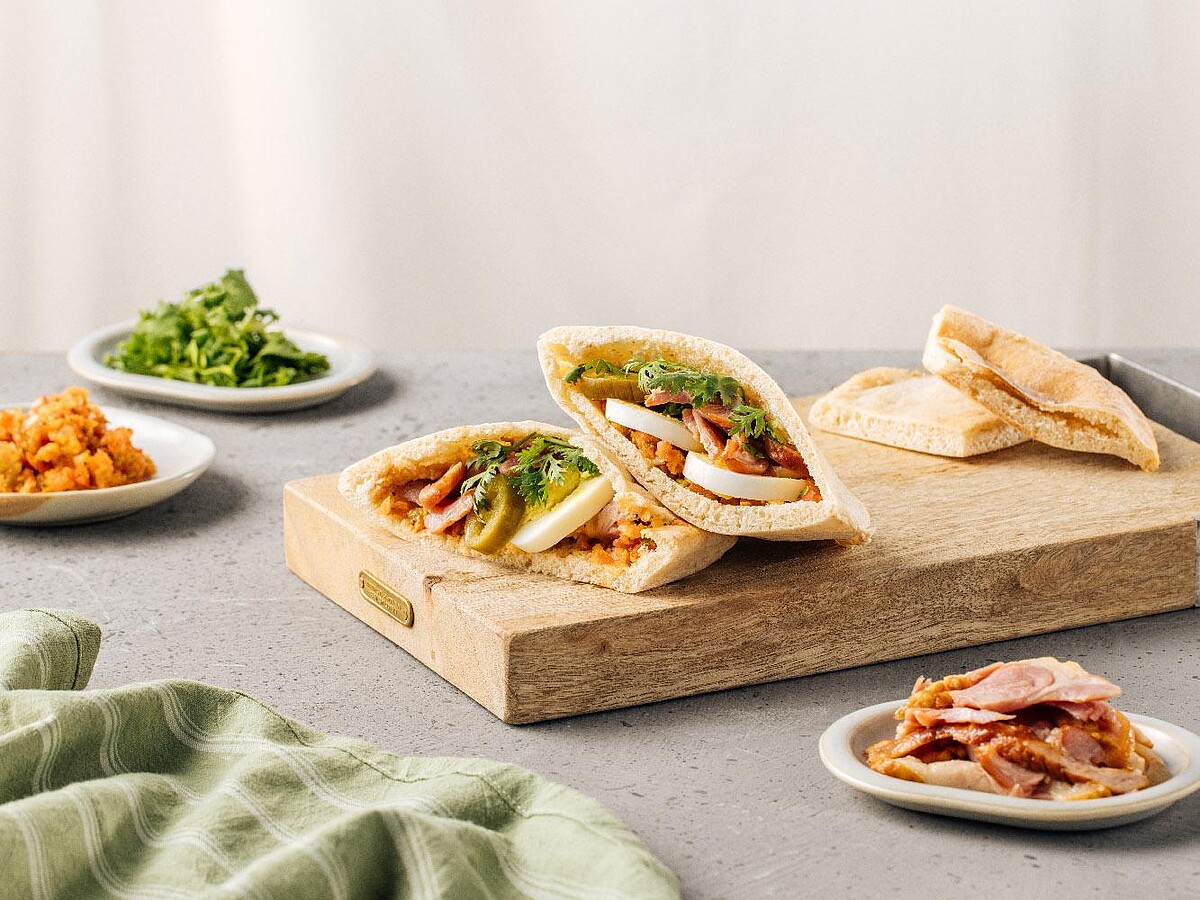 必吃推薦料理之一「蘭陽鴨賞皮塔餅」:主廚巧取源遠流長的中東麵餅「口袋餅」,夾入享負盛名的蘭陽三寶之一「蔗燻鴨賞」,佐以熱情奔放的墨西哥辣椒、水煮蛋及香菜等,並加入主廚特製酸甜莎莎醬,交織出鮮嫩芳醇、豐盈飽足的跨國界混血好食。