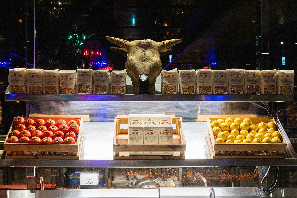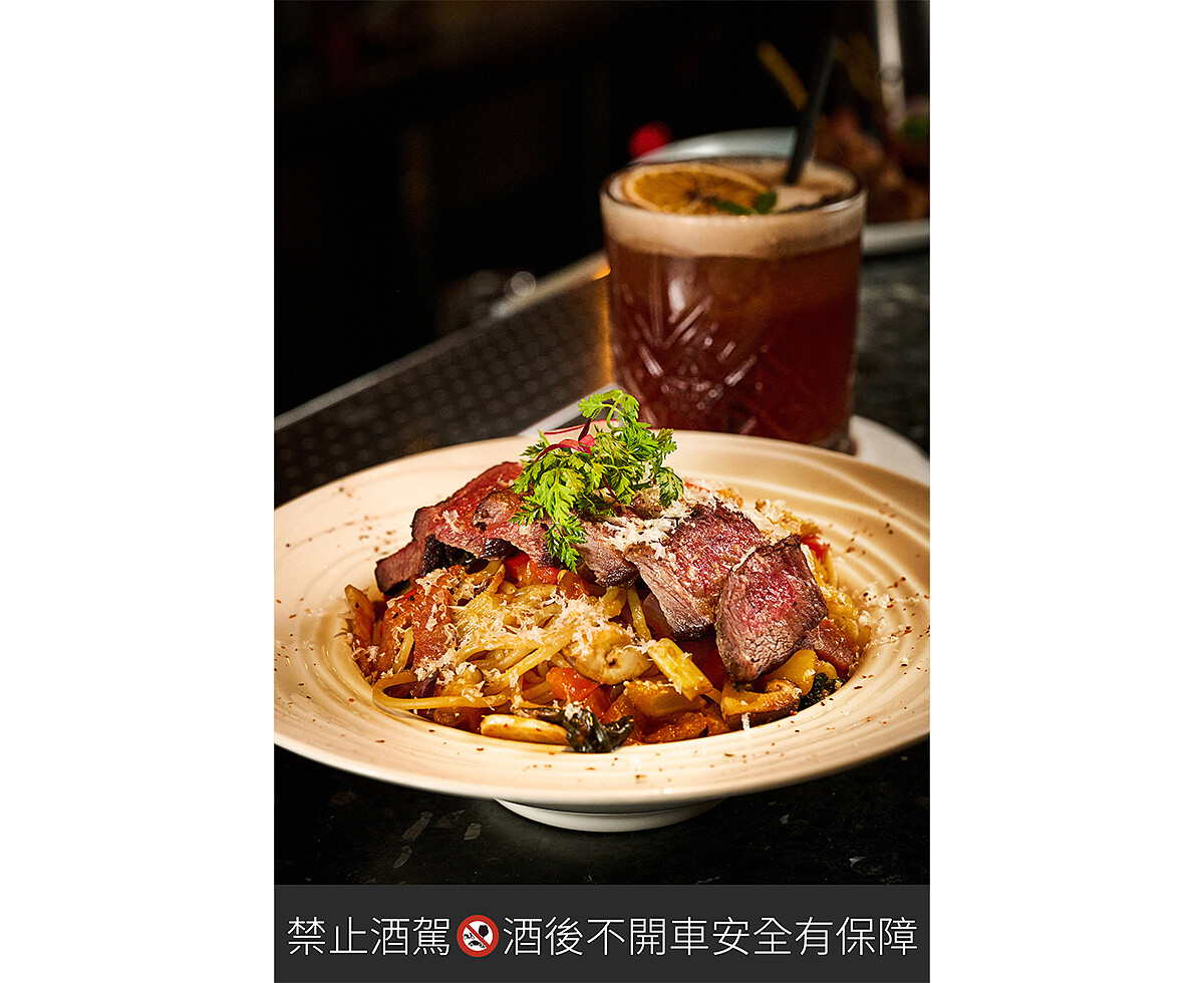 牛奶自豪地說,店裡所提供的餐點與調酒,都是超有感的大份量,光是小點就有26道任君挑選,如果第一次光臨,以下三道餐點與三杯調酒請務必嘗試一番,首先是菜單上最熱賣的「番茄嫩煎牛排義大利麵」,以自製熬煮的番茄醬汁與義大利麵翻炒後,將煎得香脆嫩口的牛板腱鋪在上頭,大大一盤絕對吃得痛快!