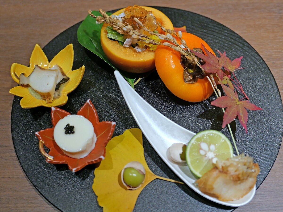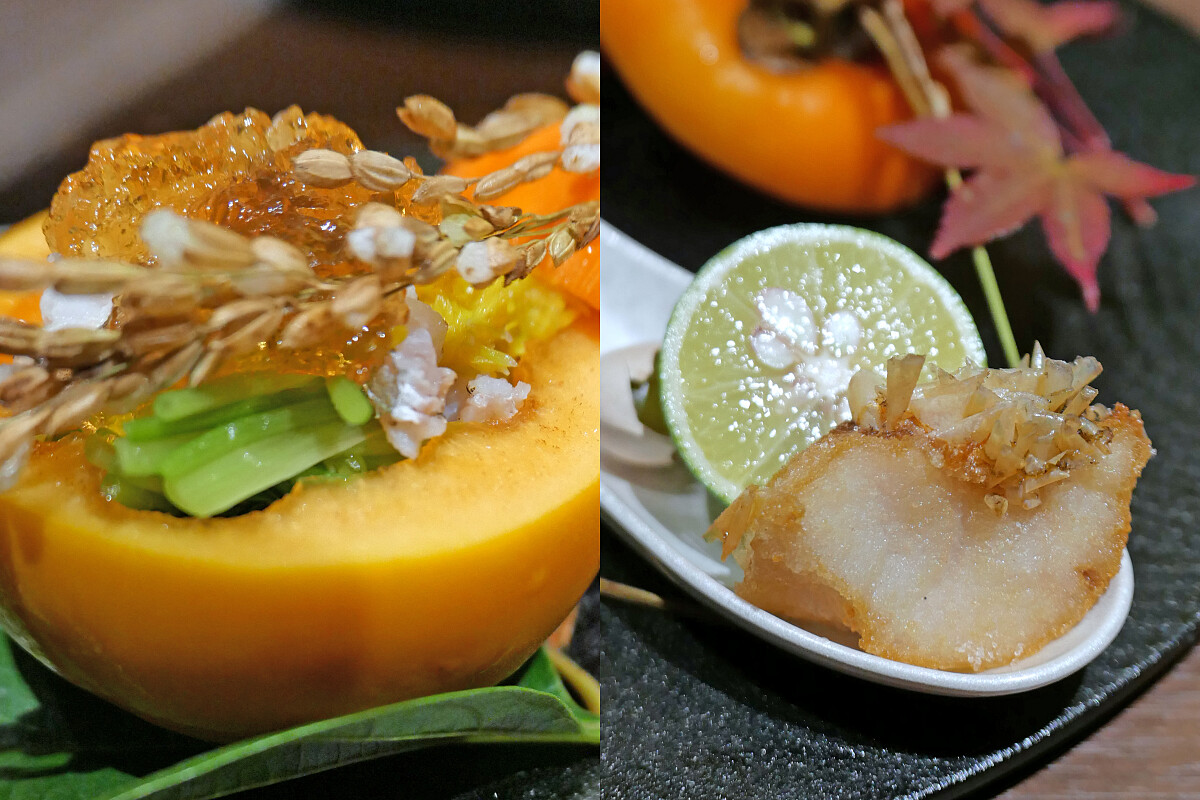 此次料理長帶來了日本的深秋氣息,以紅色楓葉器皿盛裝的「醍醐豆腐,魚子醬」,是以北海道起司製成的豆腐,綿密濃郁的香氣透過魚子醬做以提味。另有「甘鯛松笠揚」將馬頭魚以煎烤的方式完成,保留下魚肉鮮嫩且外皮酥脆,層次感豐富。而鳥取甜柿之王的「富有柿」則成為容器,裝載著碳烤切片海鰻、柿子、高湯凍。鮑魚切片則與鮑魚肝醬汁做了和諧的搭配,蒜散落其中的還有鹽烤銀杏,甘苦獨特的香氣就是秋天最具代表的滋味。