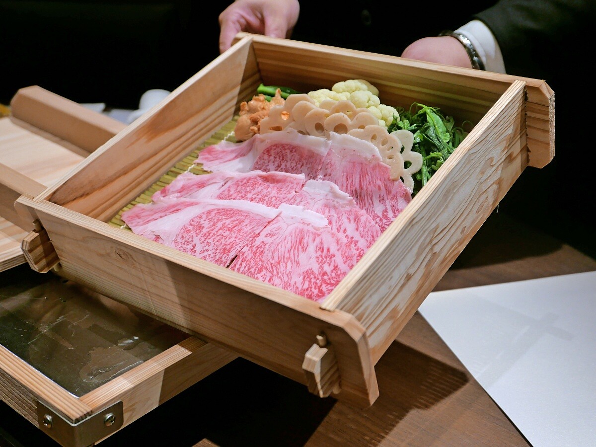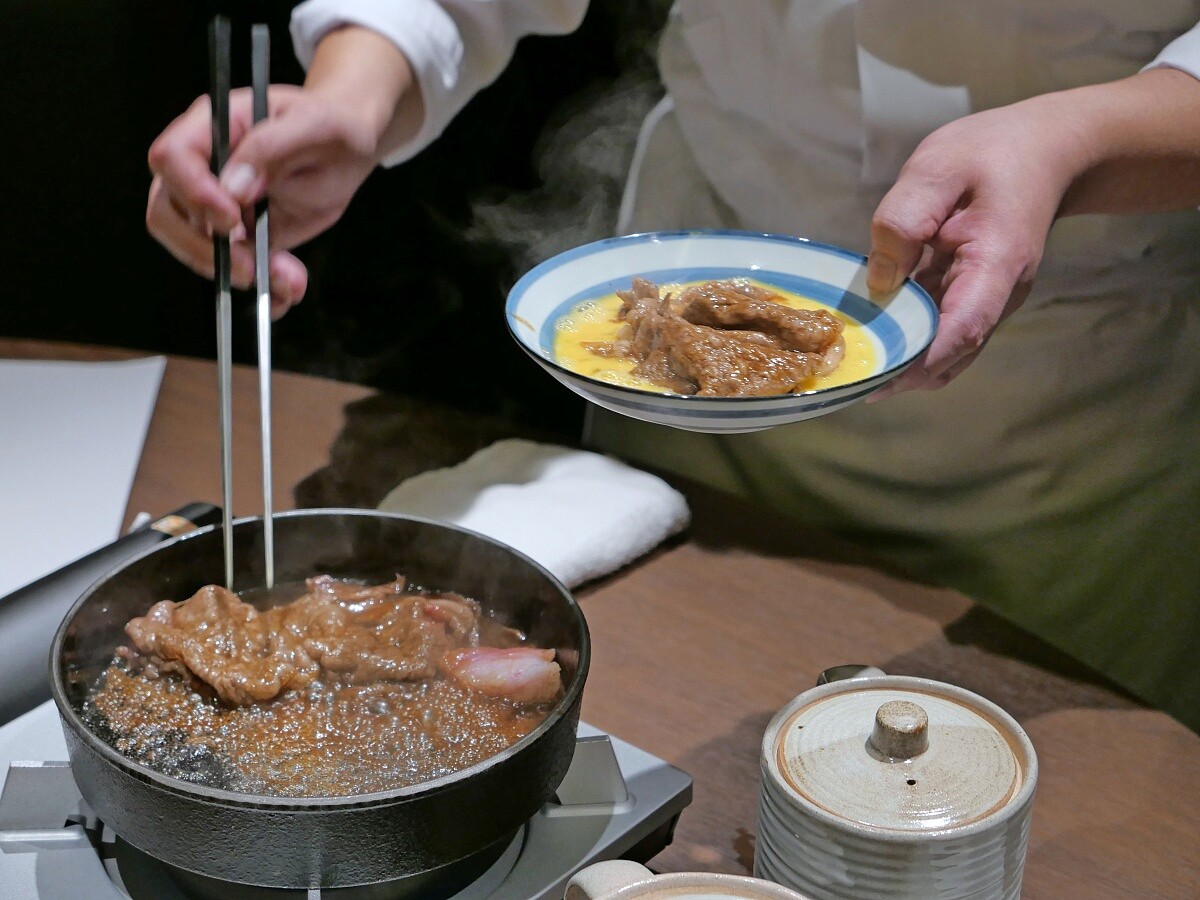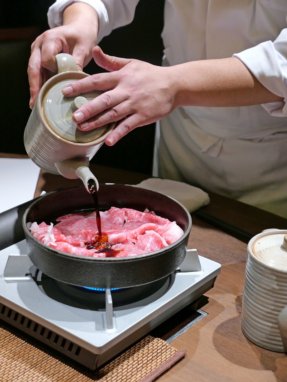 重頭戲「真珠牛壽喜燒」則由專人至桌邊服務,展演其多種料理技法,以典型的「關西風格」烹調而成。從烹煮的器皿就十分講究,料理長特地從本店帶來有150年歷史的鑄鐵鍋,上頭還有精美的店徽刻花,受熱平均能使牛肉得到恰如其分的火候控制,鎖住油脂並將香氣完美釋放。