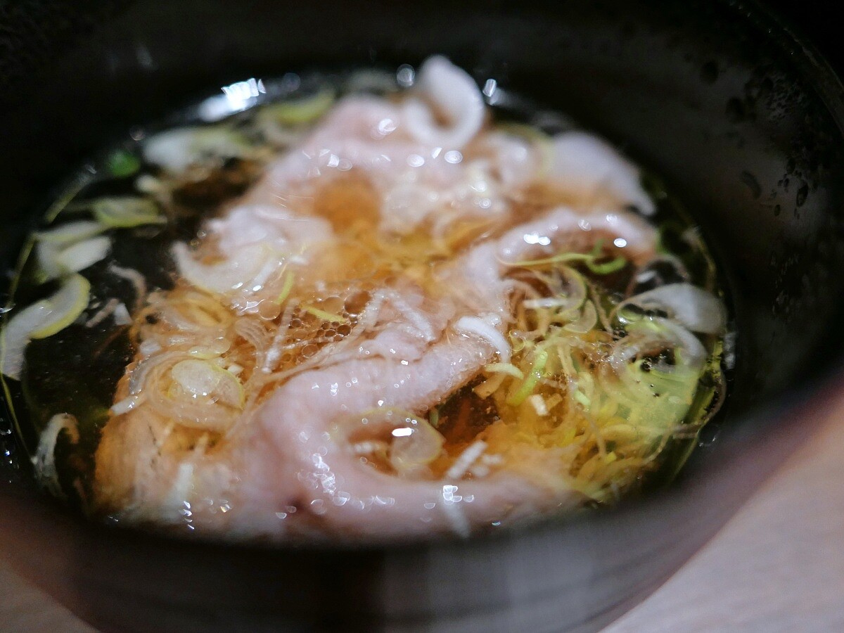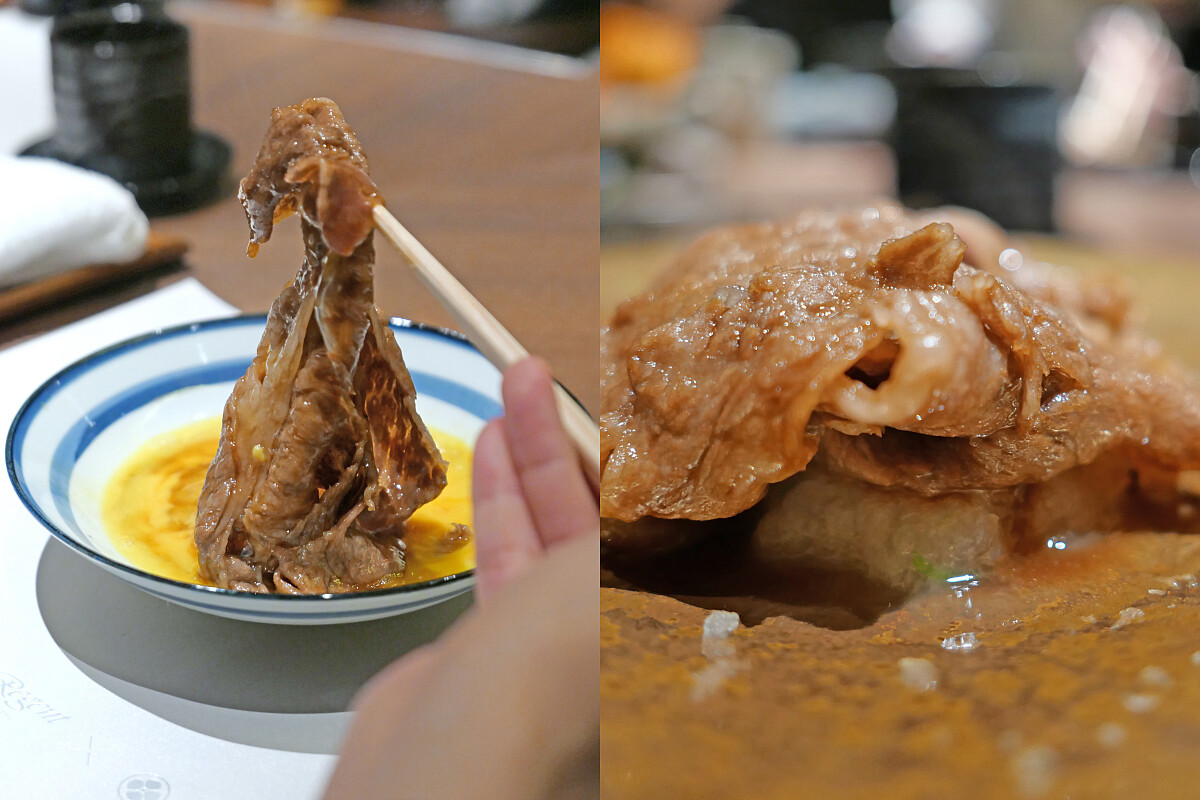溫潤醇厚的滋味,鹹香中帶有質感十足的貴氣,搭配真珠牛肋眼部位均勻細緻的油花及紅潤的肉色,上桌即是視覺享受,下鍋輕涮後散發出的誘人肉香絕對讓人一試難忘。加上燉煮過後的洋蔥釋放出的香甜、香菇飽滿的口感,全都吸附了鍋中精華。除了能沾取蛋汁享用,料理長另外搭配了紫蘇蘿蔔泥,為味覺帶來緩衝以及一股清新的風味。