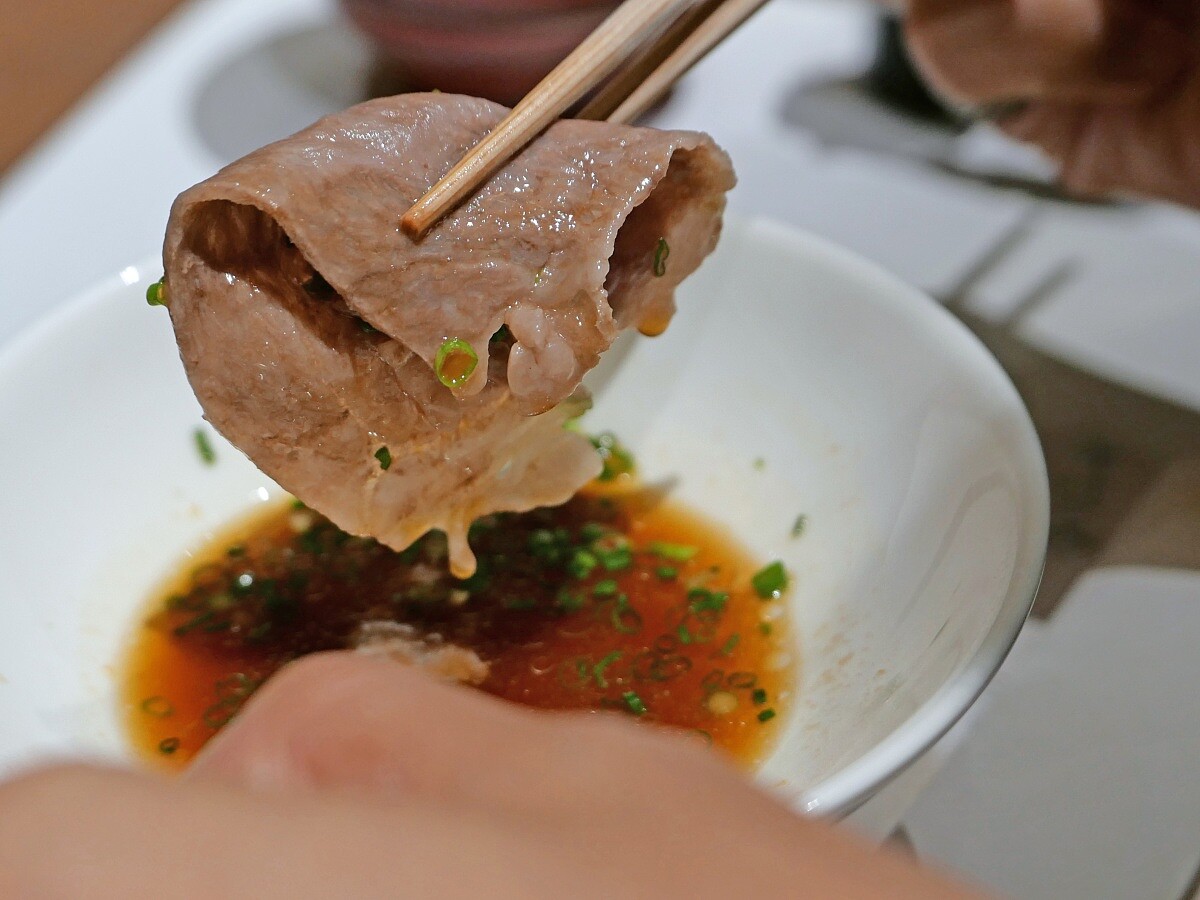可搭配「柿安料亭總店」特製的柴魚蕎麥高湯,加入蔥白末,為豐腴的牛肉轉換成清爽迷人的滋味。接著再將蔥綠加入橙醋醬中,讓迷人的柑橘香氣與牛肉完美融合,鹹香宜人。