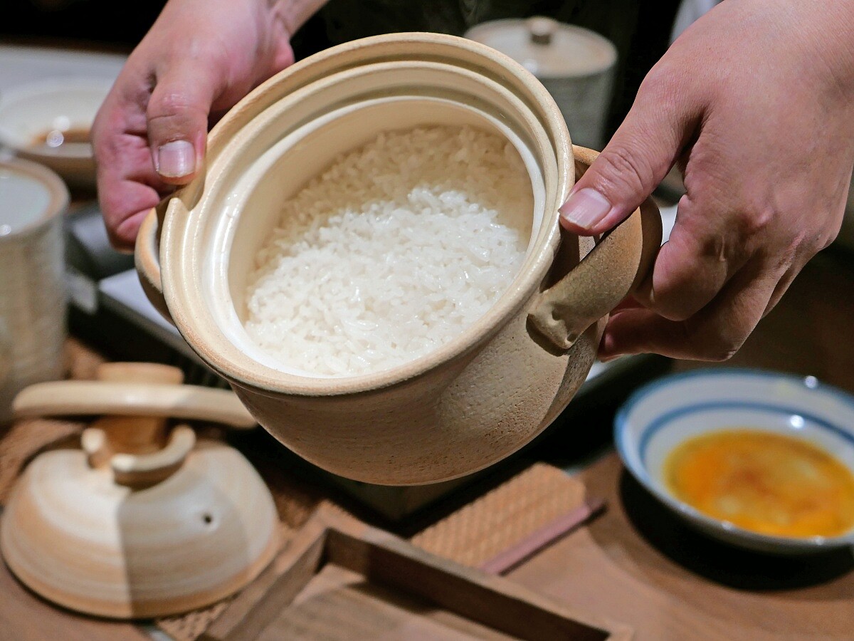 「有機仁多米釜飯」可與鍋料理與一旁的紅味噌湯、漬物及燉煮真珠牛一起享用。日本關東以「越光米」為代表,而關西則以「仁多米」著稱。仁多米來自島根縣,該地以悠久的水稻種植經驗和穩定的優質產量聞名。這款米飯圓潤彈牙、米香四溢,料理長將生米放入日式陶製釜鍋中,燜煮15分鐘後靜置,搭配燉煮的真珠牛享用。豐富的和牛油脂充分包裹每粒米飯,讓口感更加柔潤細緻。