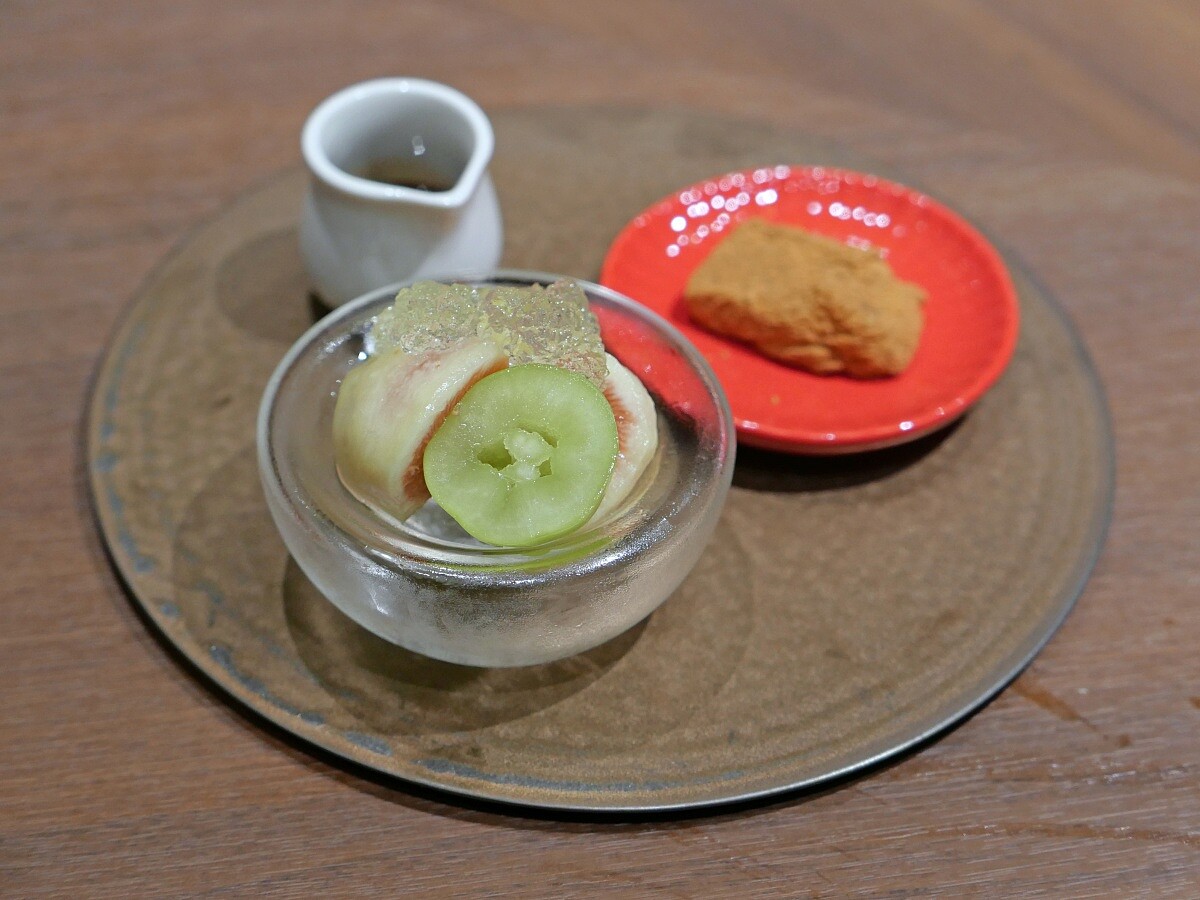 將麝香葡萄、無花果以葡萄酒漬過,最後再將酒液製成凍搭配使用,清新香甜舒緩了口腔的味覺。 最後端上「柿安」自製料亭蕨餅搭配上黑糖蜜,柔軟而富有彈性的口感,透過黑糖蜜濃郁香甜結合成最美味的結尾。