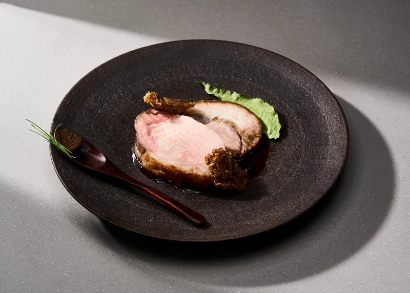 主菜將西班牙伊比利黑豬,取大里肌部位以低溫慢烤至七分熟,再取豬前腿部位以屏東萬巒豬腳的製作方式——用香料、焦糖、豬肉高湯冷熱交替燉煮,讓表皮Q彈而不膩;搭配酥炸娃娃菜、鹽漬櫻花葉與梅乾菜粉末,自由搭配兩種醬汁(燉煮豬肉汁及西京白味噌與發酵黑蒜熟成的醬汁)食用,建議由顏色淺至深搭配品嚐,更能感受其風味層次。