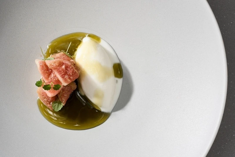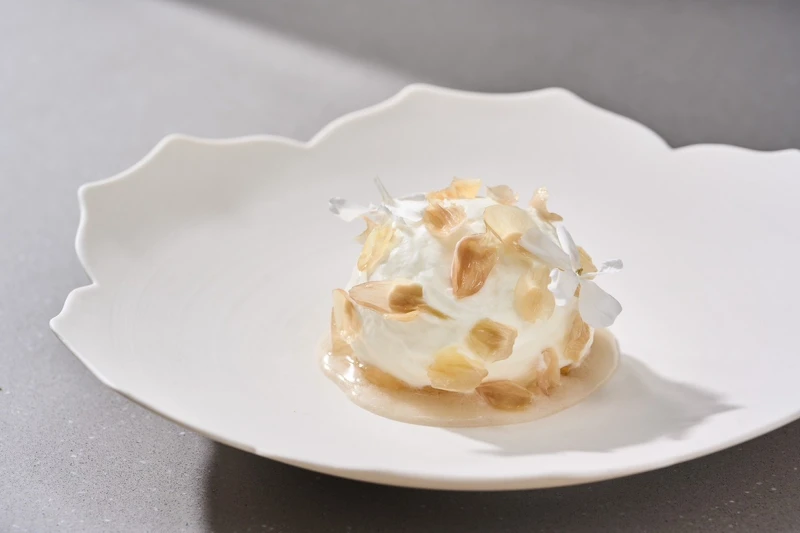 將新鮮茉莉花採摘後以醃漬蜜餞手法糖漬,搭配包裹著荔枝雪酪與龍眼果肉的瑞可塔起司泡泡,以及新鮮檸檬葉製成的蒟蒻一同搭配享用,迎來滿嘴清香,為夏季菜單劃下清香爽口的句點。