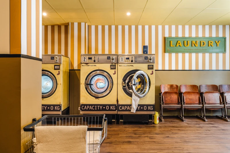 Butter Hotel奶油飯店正門口貼著招募員工的海報,讓好奇心成為引領人們探索的起點,而每位到來的顧客都將翻轉視角,變身為飯店員工,一層一層揭開奶油飯店的神秘體驗,進入一樓為洗衣間,此作為旅館最隱密的空間,卻是充滿細節與服務的表徵,洗衣機透過機器狗動物裝置與趣味性的視覺,在路徑之間體會各種創意元素的堆疊與故事氛圍的鋪陳。