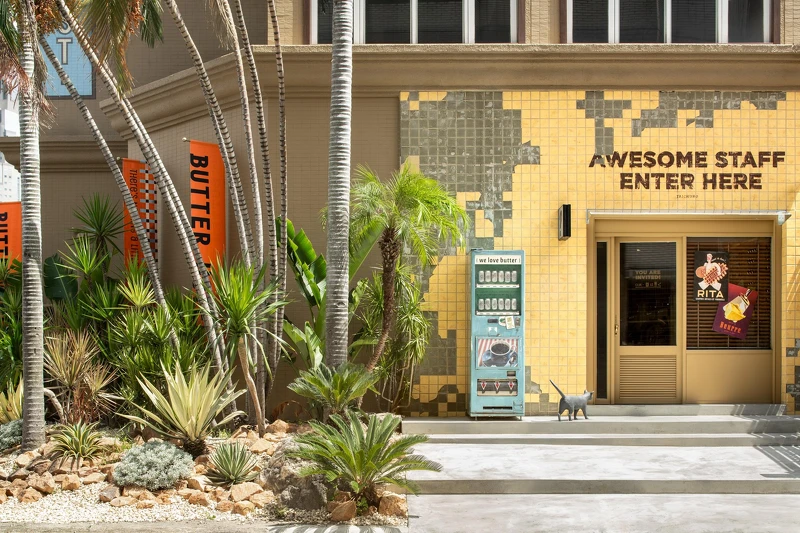 Butter Hotel奶油飯店動線的規劃刻意以探索體驗路徑引導人們先至設定為梯廳的B1,透過四部真假電梯的設置及運用不同的視覺與文案營造探索的樂趣後,可搭乘電梯直往3樓,也可跟著動線指引步上樓梯。