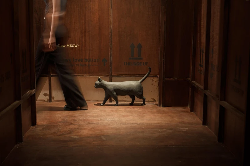 Butter Hotel奶油飯店二樓設定為藝廊空間,保留數個房間的格局,未來將作為常與不同藝術家聯名與合作的but推出藝術展演活動,未有展覽活動時,門上貓眼則設計各種呼應奶油意象的小巧思,另外自2樓貫穿3樓的逃生天井搭建空橋,仿石感的壁面上置入非常理姿態的貓咪形象,為空間引入光線外亦成為充滿趣味的一處驚奇亮點。