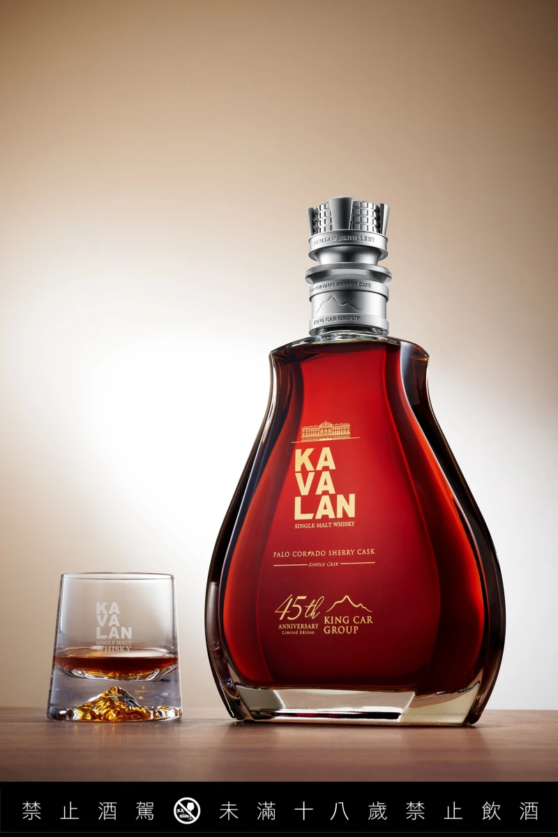 金車集團自1979年創立以來,始終堅持「突破、創新」的精神,並於2005年建立噶瑪蘭酒廠,成為台灣首座威士忌酒廠,讓台灣踏入全球威士忌產區。為慶祝45周年,噶瑪蘭推出限量的「金車45周年紀念款:噶瑪蘭 PALO CORTADO 雪莉桶單一麥芽威士忌」,選用西班牙 PALO CORTADO雪莉酒的珍稀橡木桶熟成9年以上,酒精濃度高達54%。目前全球限量10,000瓶。