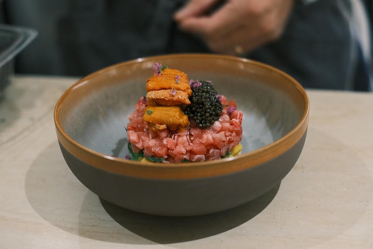 這款海鮮丼以馬鈴薯脆片取代傳統米飯,帶來輕脆爽口的口感,再淋上絲絨般的椪醋醬和薄荷油,層層堆疊的食材包括黑鮪魚中腹、Ossetra魚子醬、玉子燒和爽脆紫山藥,呈現多重滋味,另加價980元可以搭配日本馬糞海膽。