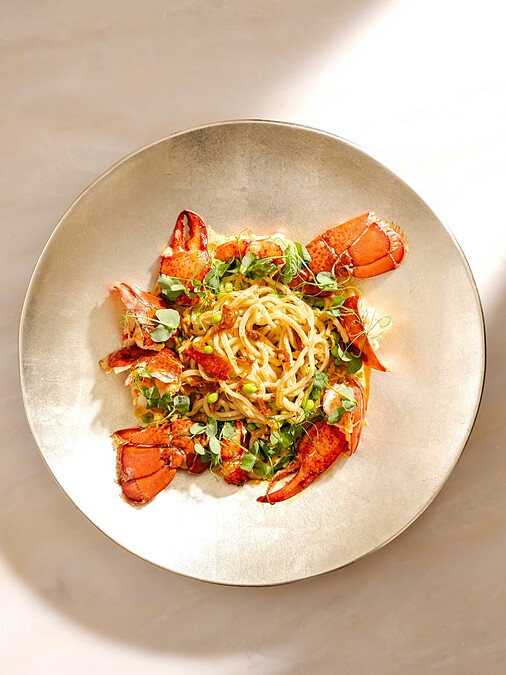 低溫慢烤的緬因龍蝦肉質鮮嫩彈牙,搭配選用北海道夢之力小麥粉製作的Q彈生麵,帶有港式撈麵的韌性,再拌入XO奶油醬,並點綴自製麻辣油與香菜油。
