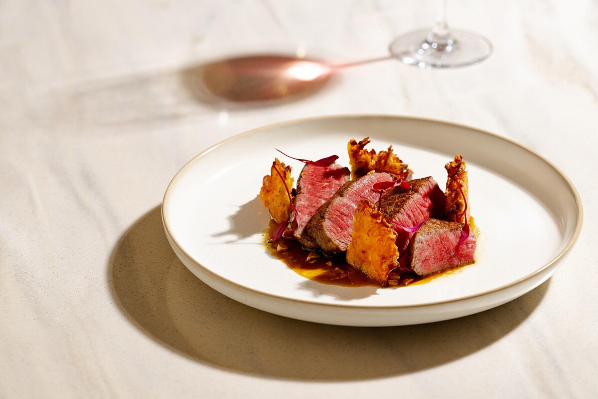 香煎至三分熟的日本A5和牛菲力,切面猶如紅寶石般晶瑩,肉質柔嫩甜美,搭配融合第戎芥末的壽喜燒芥末醬,酸香中帶濃郁。
