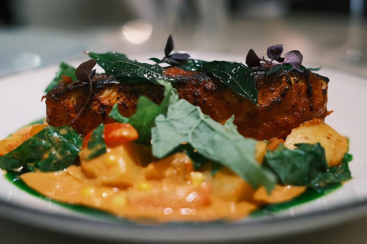 澎湖現撈土魠魚肉質厚實,經過混合薑黃、腰果、羅望子、蝦醬等印尼香料醃製後烤至鮮嫩,搭配法式酸奶和香茅,香氣濃郁,咖哩葉的微辛香更添風味。