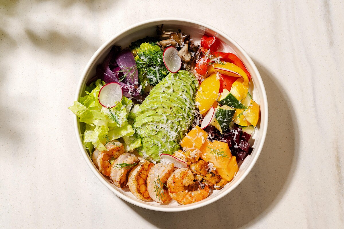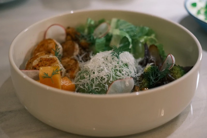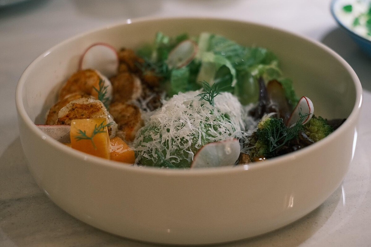 這道沙拉以韓式拌飯的五色搭配為靈感,將煎至彈嫩的草蝦與各種烤蔬菜攪拌,包含甜菜根、櫛瓜、紫洋蔥、甜椒、青花椰、舞菇,還加入新鮮的甜柿、酪梨、辣味麵包丁、蘿蔓生菜等豐富食材。