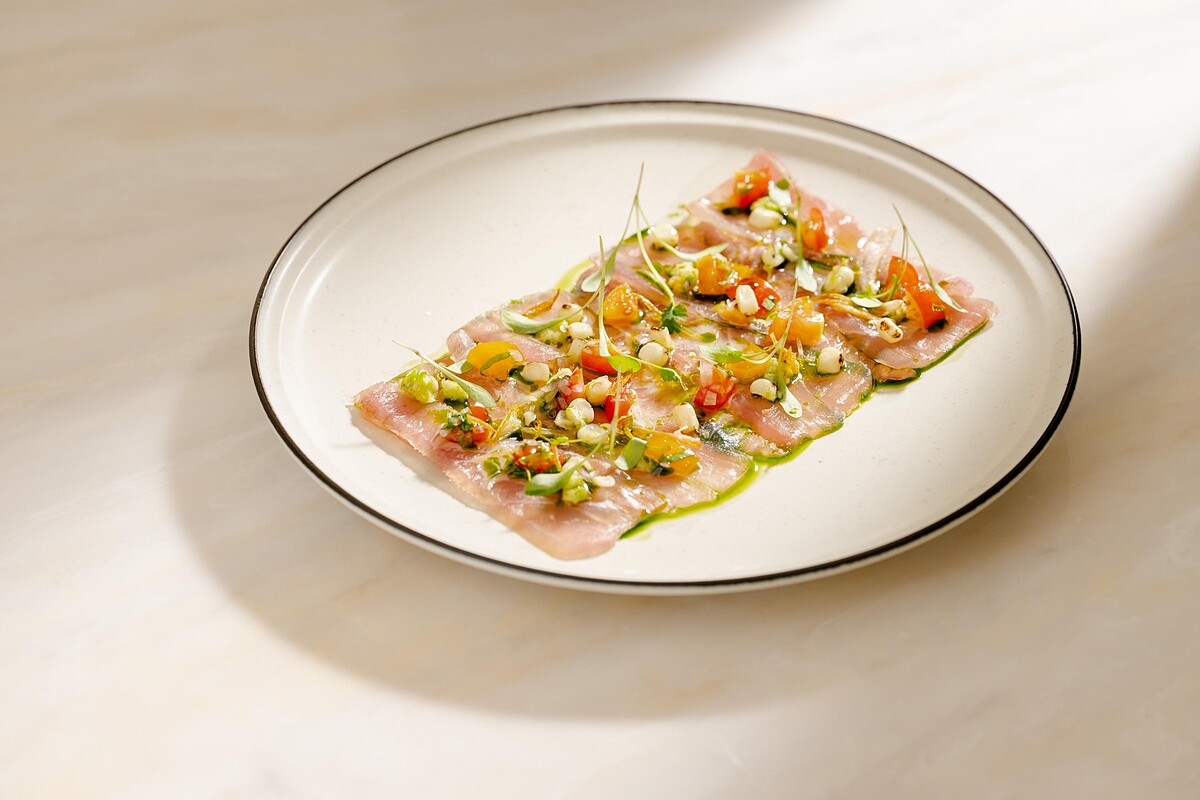 選用紅甘魚薄片,以昆布醃漬後帶來獨特的風味,再融入主廚創意的墨西哥風番茄、玉米和香菜,並加入漬辣椒和酸香的萊姆汁,微微辛辣,魚肉口感細膩,酸爽開胃。