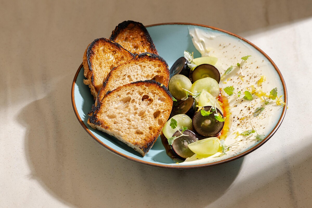 將炭烤酸裸麥麵包塗滿自製的瑞可塔乳酪和薑味葡萄醬,口感酥脆、奶香濃郁,與新鮮巨峰葡萄的柔甜、綠葡萄的清脆酸甜形成豐富對比。
