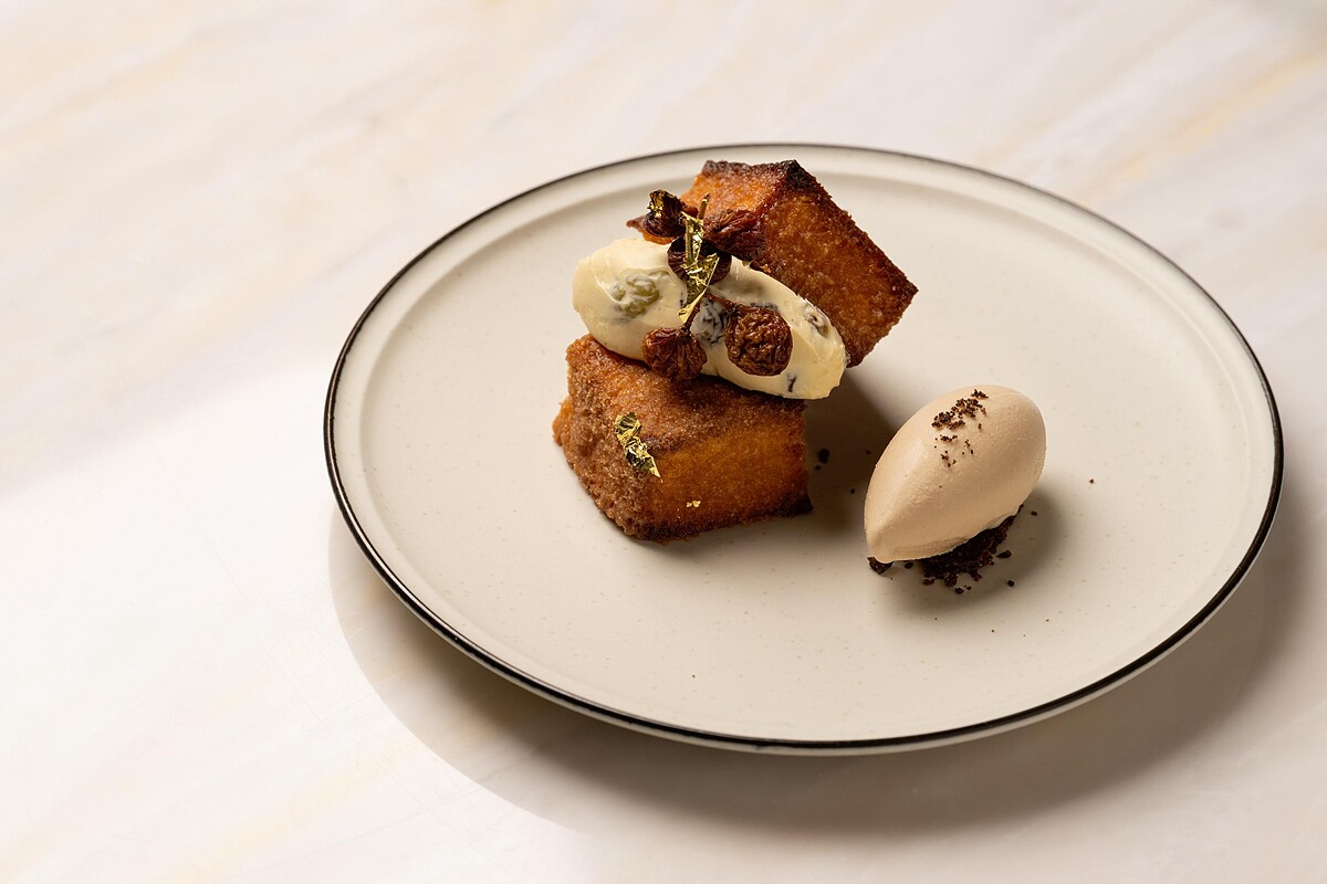這款甜點靈感來自蘭姆葡萄夾心餅乾,以SAKImoto生吐司裹上蜂蜜奶油和三溫糖,烤至外層微微焦香,再抹上拌有白蘭地酒漬葡萄乾的馬斯卡彭奶霜,柔和的奶香與甜味令人陶醉,搭配義大利草本苦酒風味的咖啡冰淇淋,為大人們帶來一抹微醺的甜蜜享受。