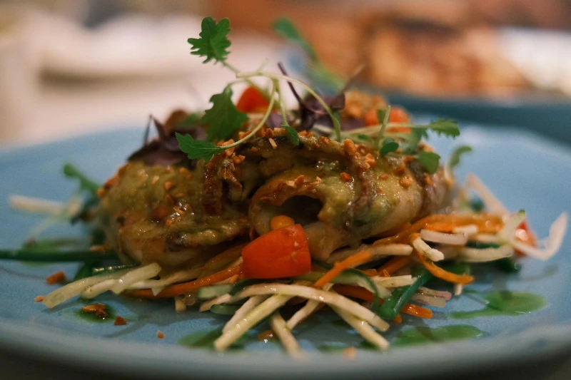 選用台式剝皮辣椒取代紅辣椒,將香煎澎湖小卷搭配酸香微辣的醬汁,再與韭菜、筊白筍、小黃瓜等蔬菜絲一同享用,呈現台灣熱炒的經典風味。