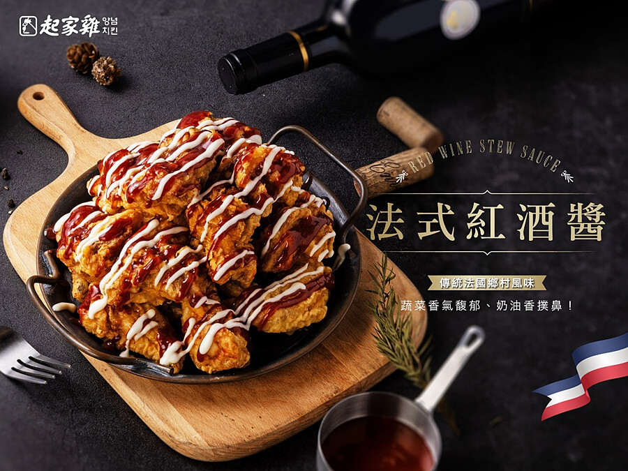 新推出的「法式紅酒醬」炸雞,以法式勃根地著名佳餚「紅酒燉香雞」(Coq au vin)燉菜料理為發想,醬汁熬煮時加入大量紅酒、蔬菜、法式香料一同慢炆,讓整體香氣馥郁、風味層次多樣!入口時,不僅有厚實的蔬菜甜味,還伴隨著紅酒的微微酸澀與淡淡焦香!微微酸的法式紅酒醬搭配上起家雞招牌韓式特調白醬,兩種風味完美mix在一起,吃起來味道酸甜濃郁、奶香味撲鼻,直接帶你進入傳統法國鄉村、深深感受到法式料理獨有的浪漫!