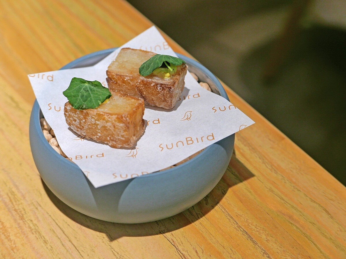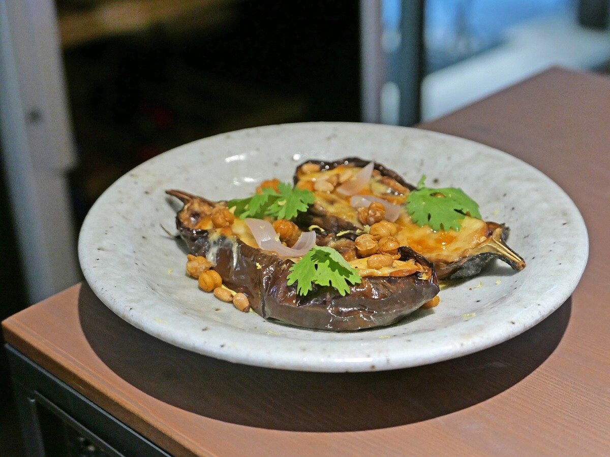 使用口感豐富的日本蛋茄,炙烤過後加上煙燻斯卡莫札乳酪焗烤,襯上咖哩優格醬,最後點綴酥炸鷹嘴豆。
