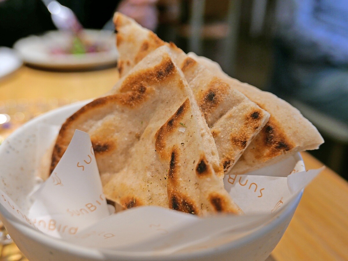 經典的鷹嘴豆泥搭配上主廚的特調香料,配上自製時蘿油與醋漬蔬菜,最後以摩洛哥香料點綴並附上香料烤餅,讓人忍不住一口接一口。