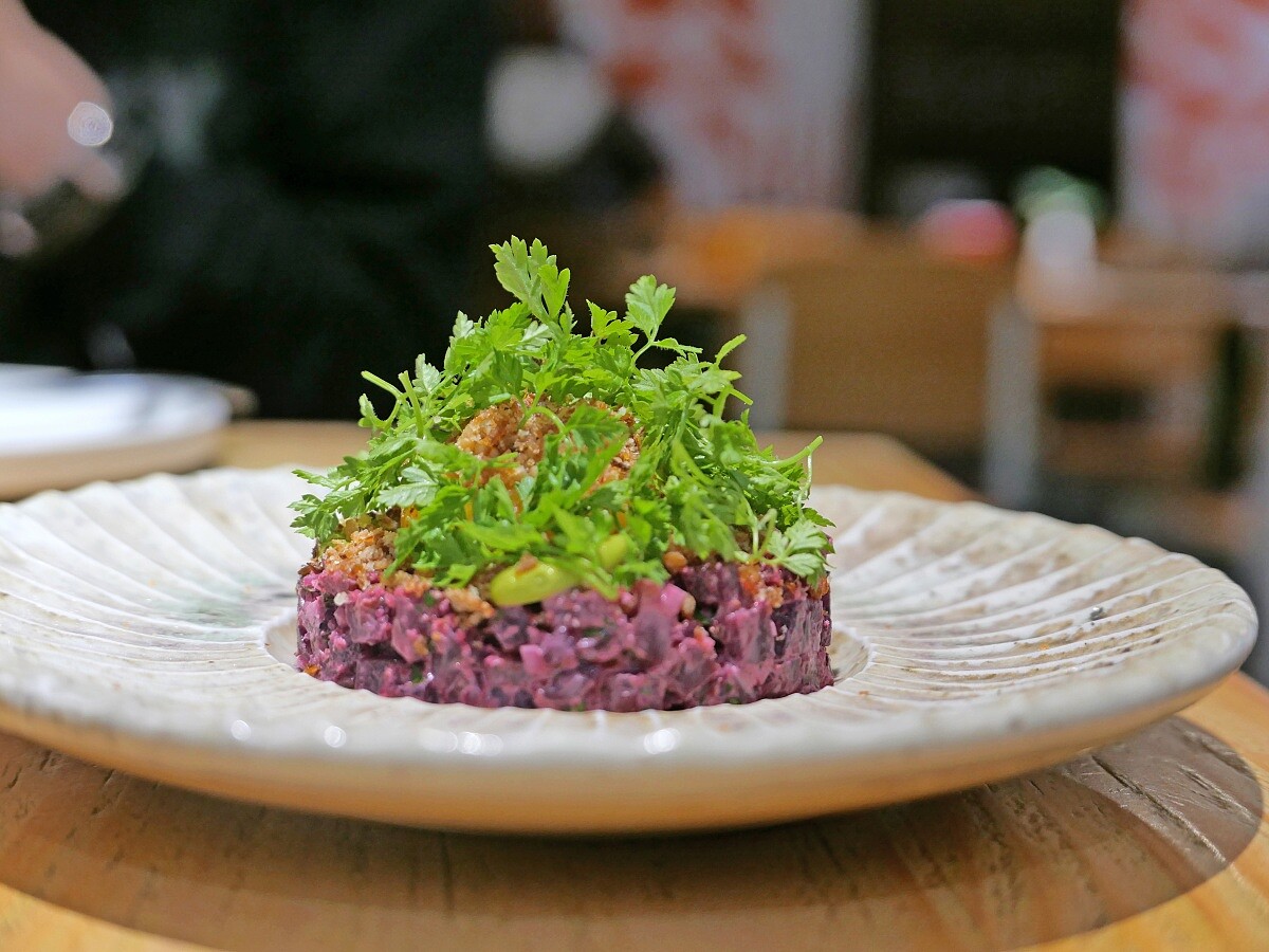 將常見的韃靼改用紅甜菜為主角,以酸瓜、酸豆、干蔥和日式美乃滋,佐上油封蛋黃與自製茵陳蒿美乃滋,最後以酥炸洋蔥收尾。