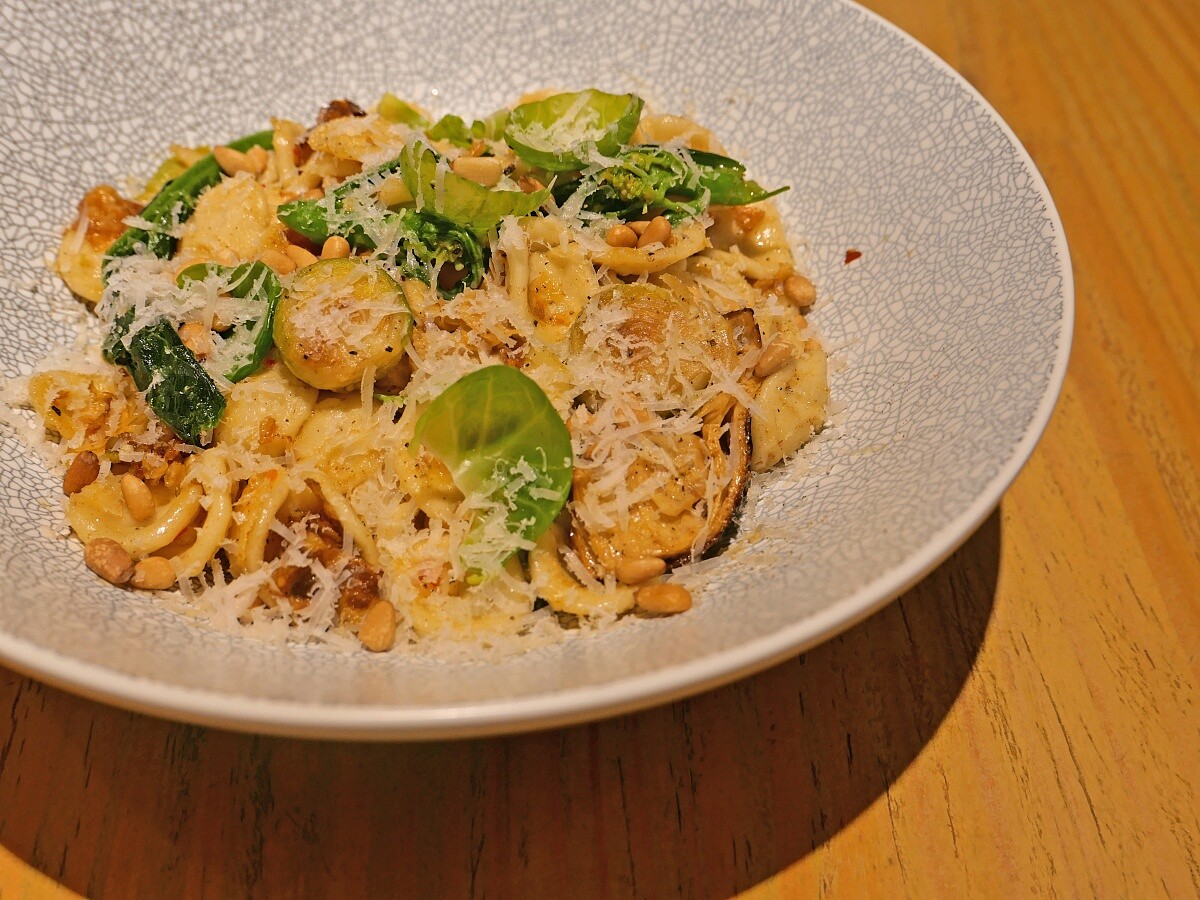 將豆皮與孢子甘藍嫩煎後帶出香氣,加上自製的辣橄欖油與青花筍拌炒,使用有點厚度與咬勁的貓耳麵,最後佐以松子與帕馬森起司提香。