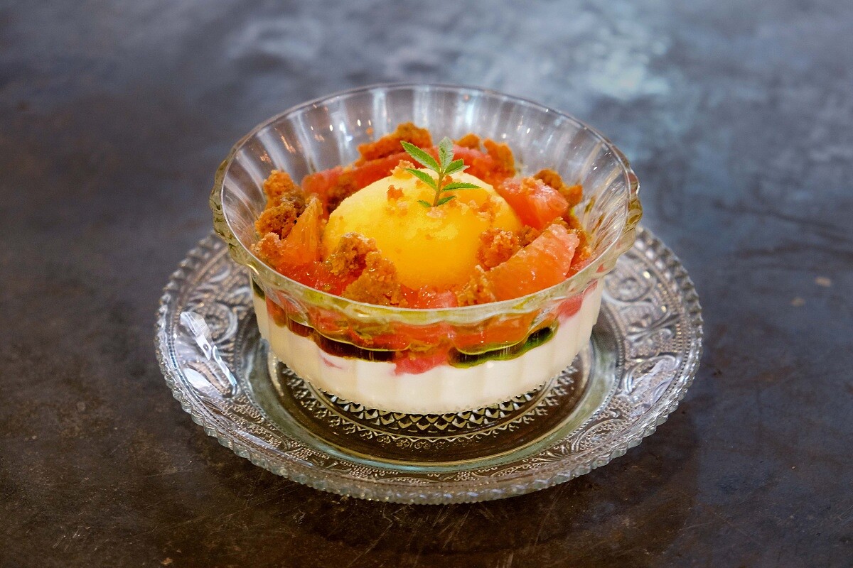 自製柑橘風味的雪酪,襯上檸檬風味凝乳,搭配新鮮的柳橙與葡萄柚,以萬壽菊橄欖油增添香氣,清爽又解膩。
