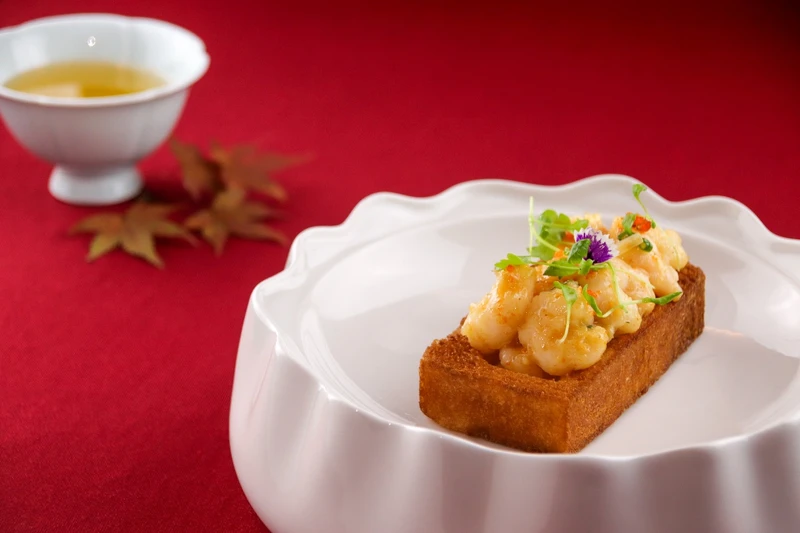 蟹品:大閘蟹 借鑒法餐美感,將吐司塊炸如黃金般酥脆,佐以天香樓經典蟹粉蝦仁醬汁一同品嚐,視覺小巧更富樂趣。Tea Pairing 同樣選用來自北埔的東方美人。