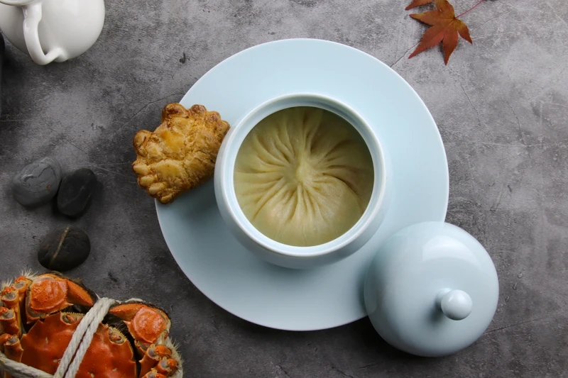 蟹品:沙母 一別過往揉合豚肉與蟹肉,鮮蟳獅子頭燉湯仿經典淮揚菜做工,取沙母蟹肉鑲入豚肉團中心,以古法慢燉老母雞、金華火腿4小時,乳白湯頭,湯鮮味美。吸附豚肉、鮮蟹的濃郁湯頭,清淡高雅,凸顯本味。