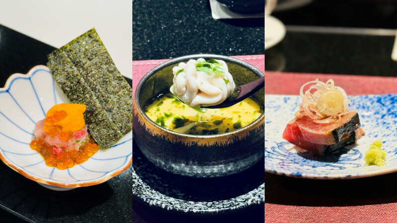 另外一道「松葉蟹海膽海苔天婦羅」,外觀炸至成金黃酥脆,包裹鮮嫩松葉蟹與新鮮馬糞海膽,一口咬下鮮甜滋味滿溢,「楚蟹土鍋御飯」更是重頭戲,將蟹肉、白蘿蔔、米飯於高湯煮製後悶煮,每粒米飯浸潤松葉蟹的香氣,再加上鮭魚卵提升層次,是最滿足的結尾。