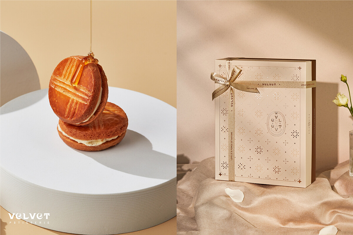 法絨不只是螞蟻人的心頭好,更是愛馬仕、香奈兒等國際精品訂製會指定點心,這次的新品「嫣紅誓約」喜餅禮盒以勃艮第酒紅為基色,再用燙金線條作為點綴,獨特的幾何圖形和光影是一大特色。最重要的創意甜點結合了台灣、法國特色,以純粹天然的原料結合繁複的手工製作而成,包含達克瓦茲、蛋糕、餅乾、喜糖還能依照喜好需求彈性選配,真的超級貼心!