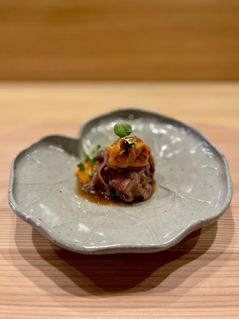 使用熊本縣最高等級A5黑樺和牛,搭配北海道海膽、西伯利亞魚子醬以及南投童子雞蛋黃,除了和牛油花細緻、吃起來油而不膩外,蛋黃更是經過特殊手法處理,綿密的口感就如同慕斯一般,絕對是米其林等級美食。