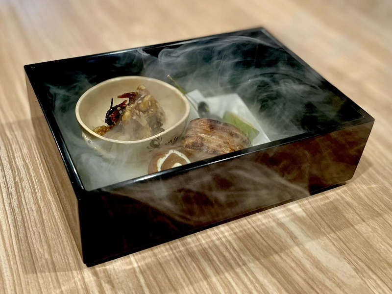 使用長崎縣鰆魚,魚肉鮮甜紮實,除了搭配主廚特製豆腐醬,還有沁人心脾的櫻花木燻香。一打開蓋子就能聞到櫻花木香氣,讓人宛如身處於日本,是視覺、嗅覺、味覺的三重饗宴。