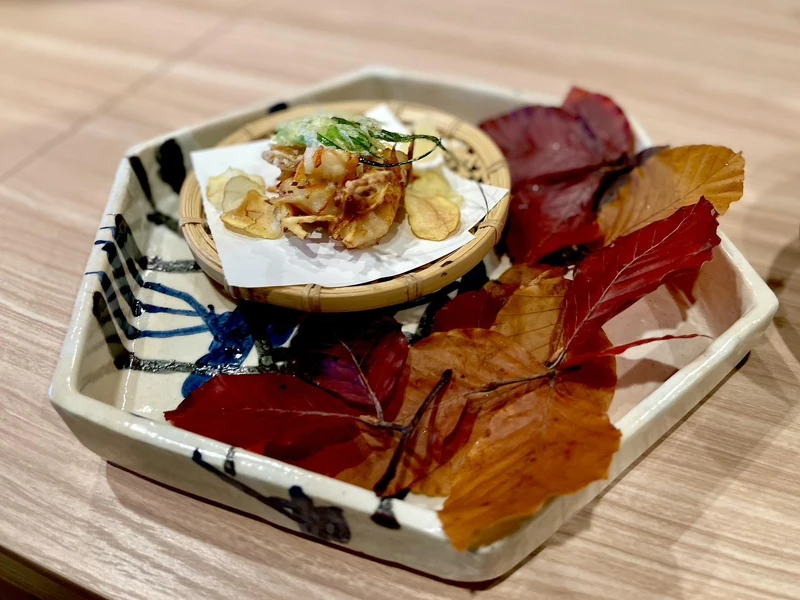 以海苔作為麵衣,搭配無花果、秀珍菇與蘆筍,搭配檸檬或松露鹽,雖然是炸物吃起來卻不會讓人覺得有負擔,口感酥脆又清爽,一口一片非常開胃。