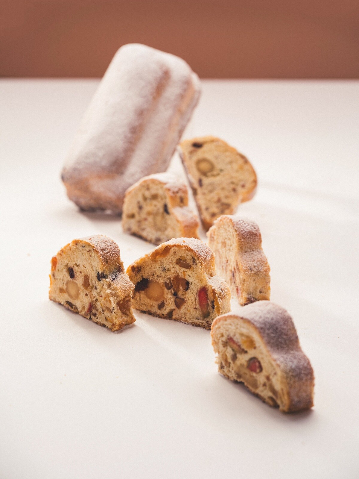 跳脫常見的葡萄乾與蘭姆酒風格,Chef Kang 以紅心芭樂乾、高山蜜桃乾加入麵團,搭配蔓越莓與柑橘漬果,將史多倫變成帶有赤紅色調與台灣果香的節日版本,風味更圓潤也更具地方特色。 NT450(販售時間:即日起至2026年1月31日)