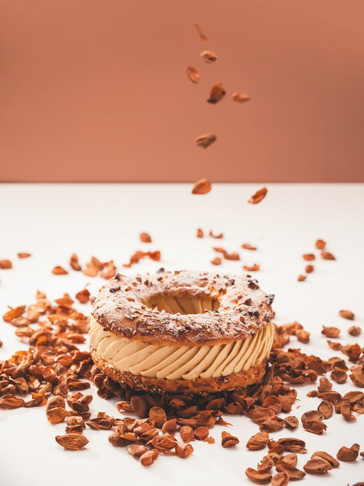 以自行車賽誕生的法式經典 Paris–Brest 為靈感,Chef Kang 以壯圍花生製成花生杏仁帕林內與慕斯林奶霜,取代傳統榛果,讓整體口感多了台灣風土的溫暖香氣。圓形造型如花圈,也讓它成為極具節慶感的餐桌主角。NT1,080(販售時間:即日起至2026年1月31日)