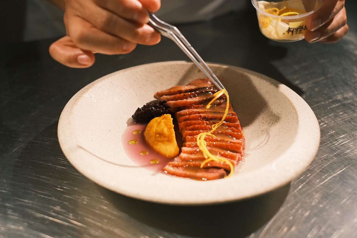 現今 嫣紅番鴨:選用土番鴨,融合中西式烹調手法,搭配胡蘿蔔泥醬和鳳梨澄清水。
