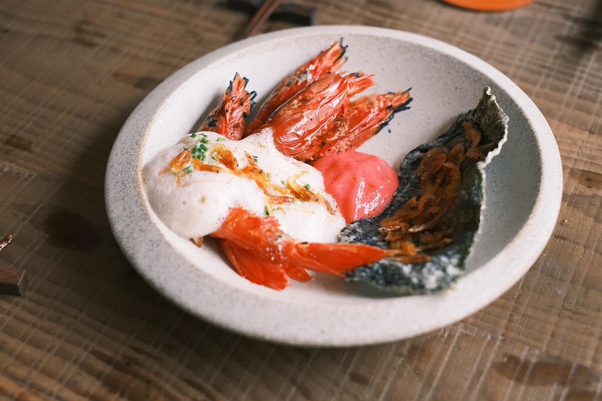 水果胭脂蝦:延伸自中菜中常見的鳳梨蝦球,選用東北角胭脂蝦碳火燒烤至半生熟,保留汁水豐厚的蝦頭。