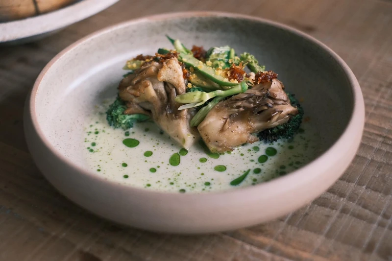 時令鮮蔬:以蘆筍根部搭配鮮奶麴醬提煉醬汁,加入中式調性,以 XO 醬刷烤爐烤過的主體綠花椰菜搭配。