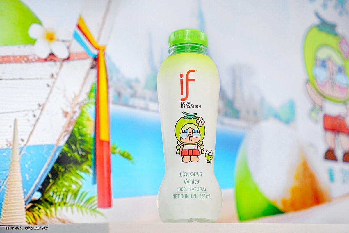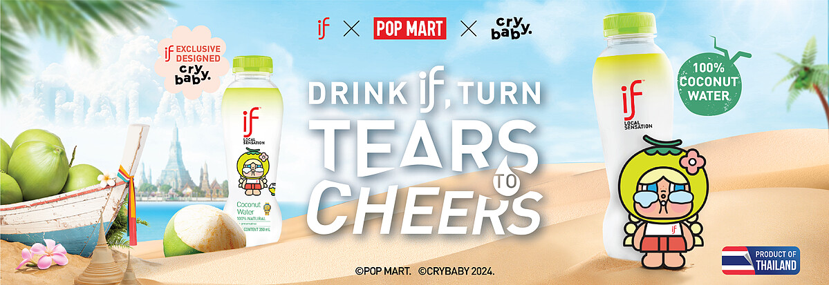 這次合作可不簡單,IF是首個與泡泡瑪特合作的泰國飲料品牌,他們還特地邀請了泡泡瑪特泰國的藝術家Molly,將聯名角色 「CRYBABY」融入了泰國經典元素。靈感來源是傳統遊戲「椰殼鞋」加上椰子元素,打造出兩款趣味滿滿的形象,將健康生活和潮流藝術完美結合,讓你在喝椰子水的同時,也能感受到滿滿的藝術氛圍。