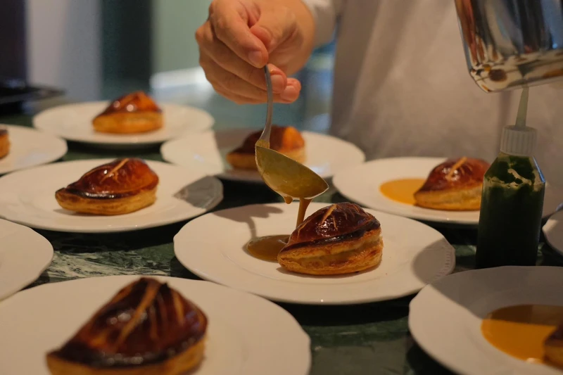 這道主菜結合了鮭魚與海膽的鮮甜,以及菠菜的清香,搭配酥脆的派皮,無論視覺還是味覺都讓人驚豔。這道菜以海膽和菠菜醬提升整體層次,成為餐桌的絕對焦點。