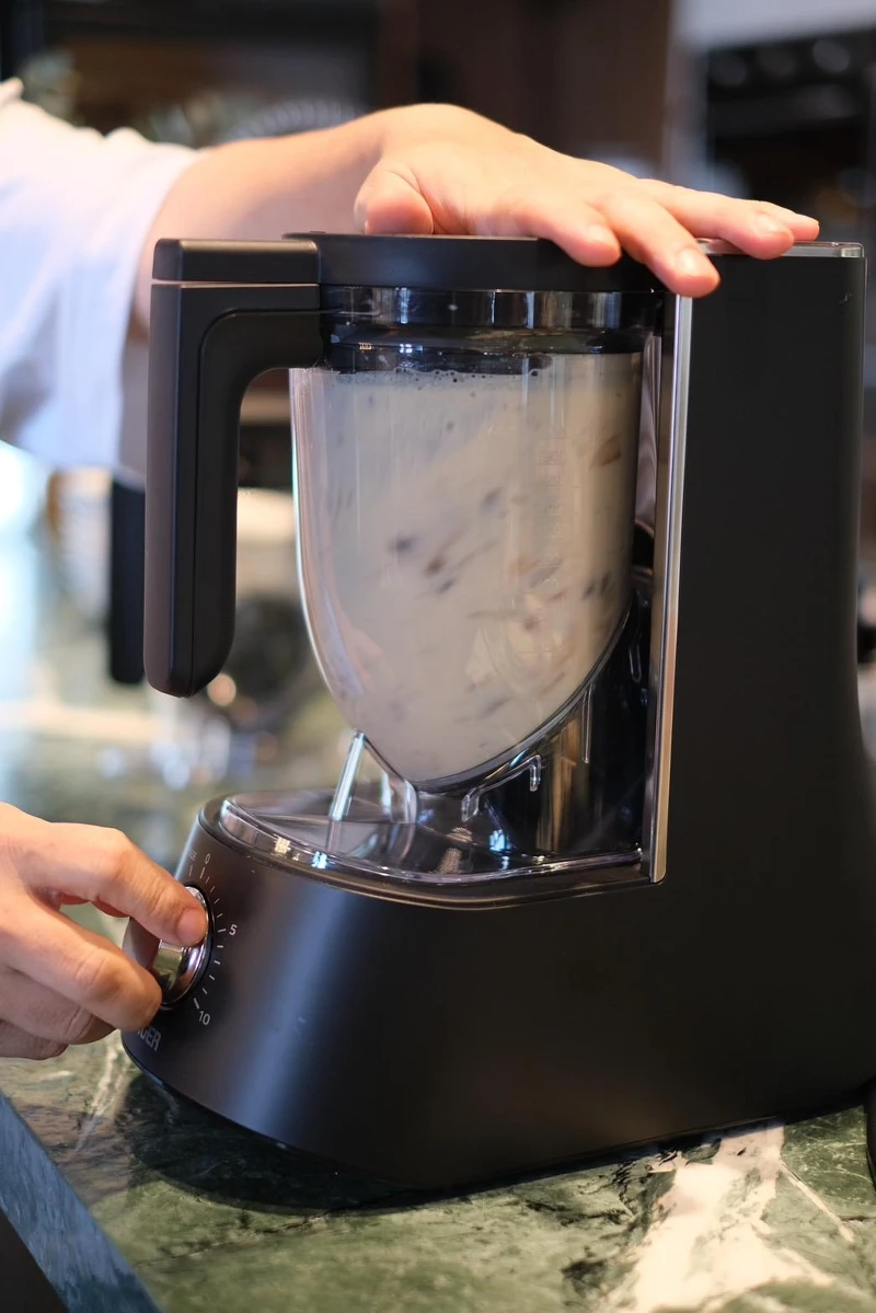 3. 湯底製作:待高湯冷卻至40度以下,用虎牌調理機攪打成滑順湯底,加入豆乳、鮮奶油和奶油,稍微調味即可。
