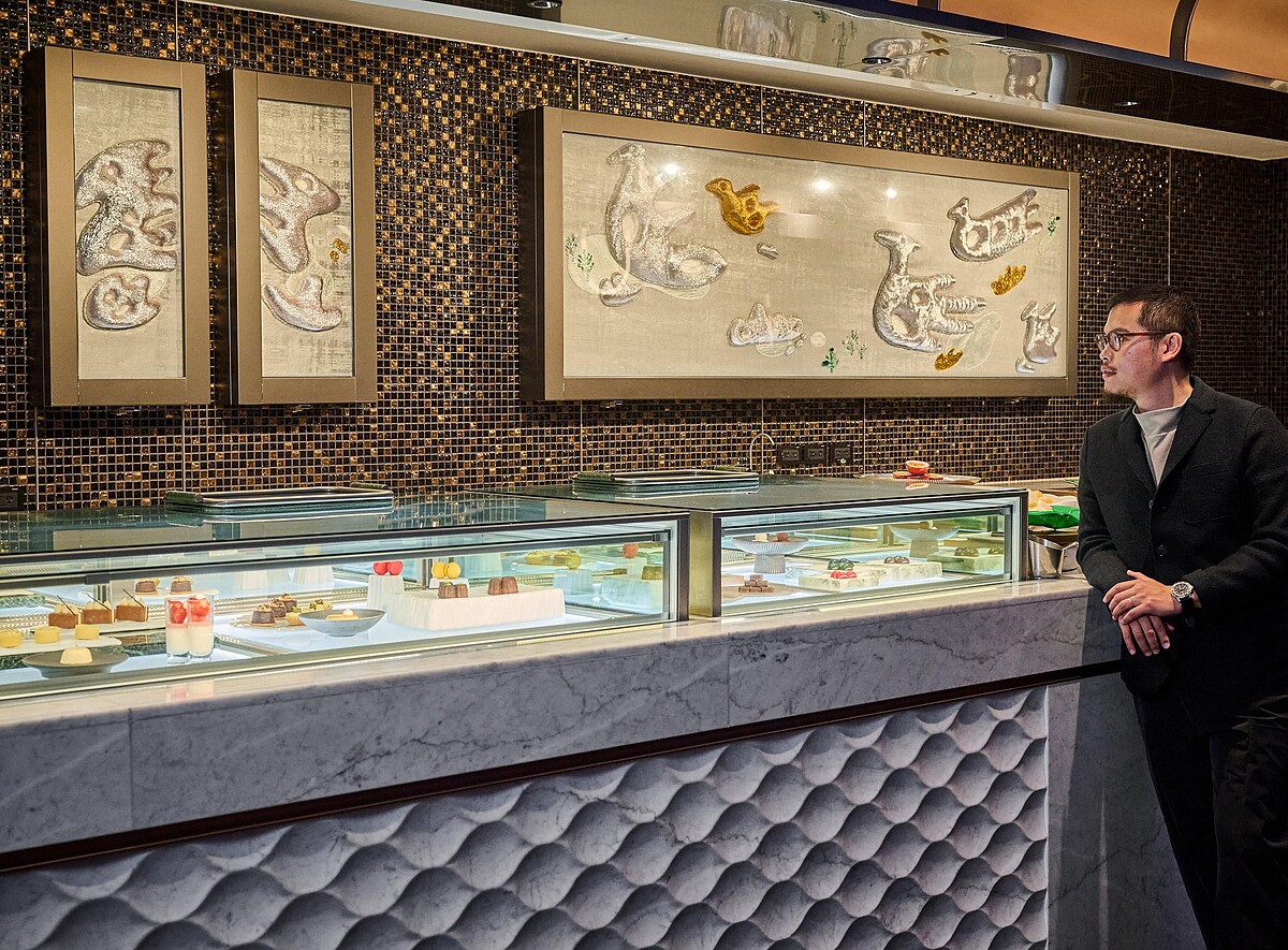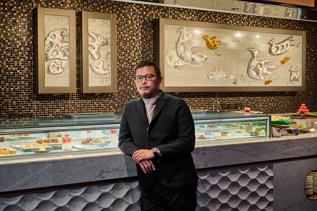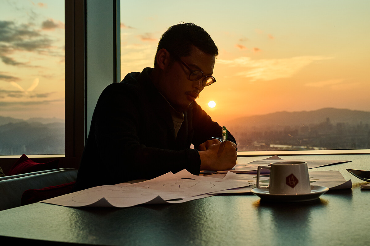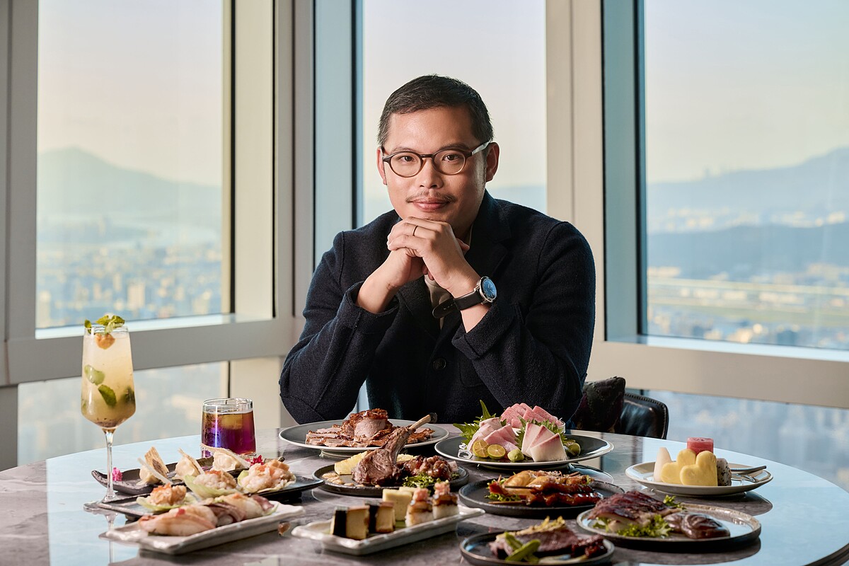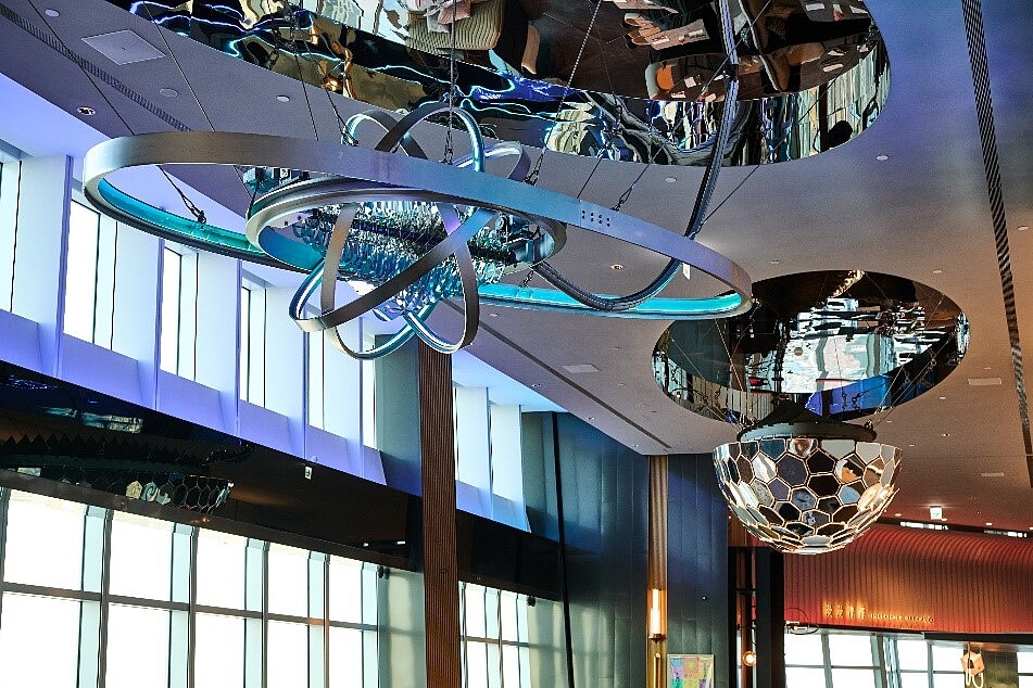 在藝術裝置的體驗上,則是非常難得的跨界統籌,像是在101大樓的頂端360度環景視野中用餐,彷彿沈浸在漂浮的小島中,也象徵台灣與海洋的關係。隨著取餐動線,也可以看到「山」、「海」、「原」、「城」四個代表台灣的主題空間。他也非常欣賞「城」用餐區天花板的三個巨型裝置,知名的互動裝置設計公司「天工開物」以馬達與光柱打造出的仿生「未來體」,讓用餐的賓客透過藝術家視角,感受城市的近未來現代。