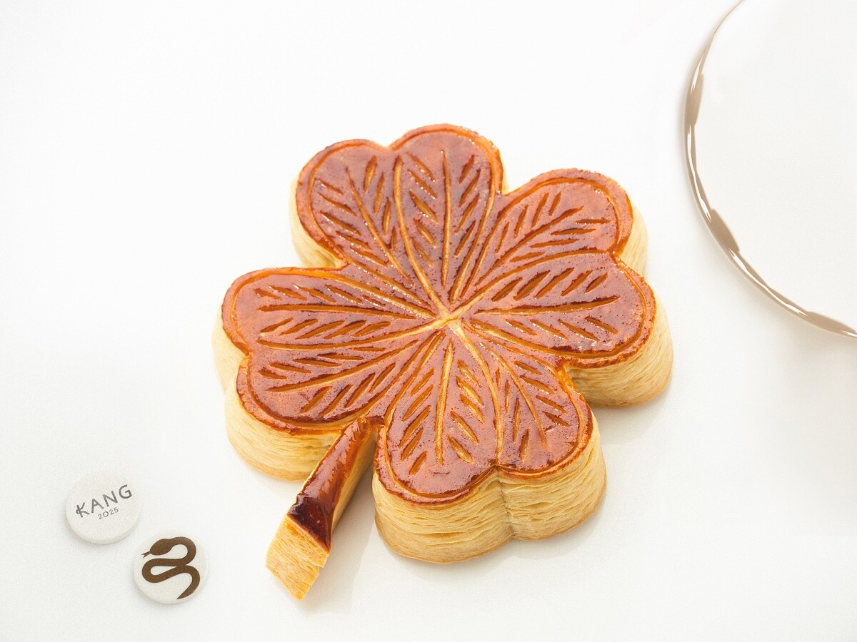 適逢聖誕佳節,主廚最近也拿出拿手之作「國王派」,這也是節慶餐桌炒熱氣氛的最佳甜點。而目前已經開放預購,除了圓形的傳統法式國王派(售價NT1,680),另有超級限量版的幸運草國王派(售價NT1,880),由於做工繁複,因此僅限量50個,售完為止。