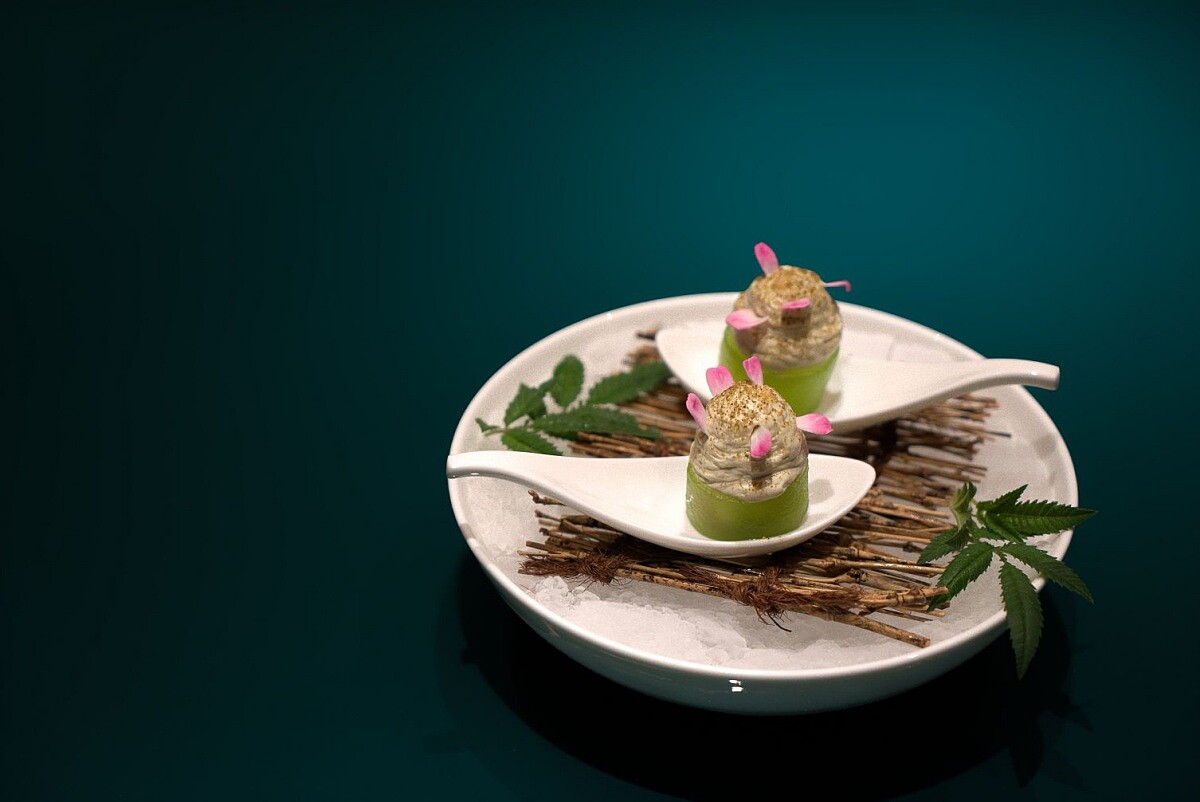 開胃小品以二十四節氣中的「寒露」為靈感,象徵深秋的腳步悄然來臨。瑪莎拉咖哩醬用腰果和多種香料熬煮,包入烤得薄脆的春捲皮中,變成香氣撲鼻的小捲餅。上層覆蓋羊奶、紅茶和馬茲卡彭起司打出的綿密奶泡,透過氮氣加壓呈現柔滑質地。咖哩的濃郁辛香混合羊奶紅茶的溫潤氣息,像深秋午後的陽光舒心愉悅。
