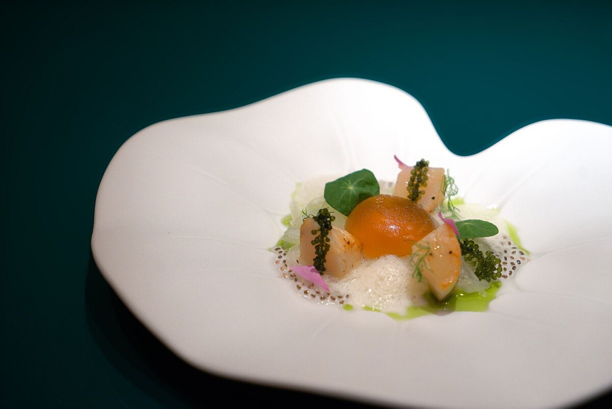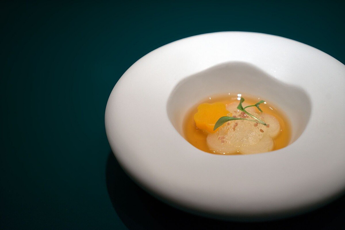 粵菜中冬瓜不僅是夏日清涼的好食材,在秋冬也能成為溫補佳品。這道冷前菜以手搖飲「冬瓜檸檬」的風味組合出發,選用北海道干貝、海葡萄和奇亞籽,搭配檸檬醃漬的冬瓜絲,再放上一顆由冬瓜茶、澄清蕃茄汁和香水蓮花調製的晶球,淋上自製鹹檸檬泡沫和無花果葉油,層次豐富如同一片翠綠池塘。干貝的鮮美與冬瓜的清甜交織,鹹檸檬與蕃茄的酸香提升了整體風味,清新爽口,晶球輕輕劃開時,也揭幕了冬日到來。