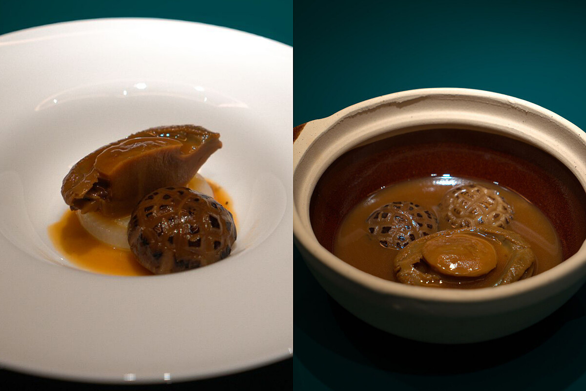 另有升級版的「冬至珍饈」,使用更為高檔的13頭南非乾鮑,主廚透過高湯慢煨,完整保留下鮑魚的鮮甜與濃郁香氣,再以少量冰糖和蠔油微微提味,讓滋味更豐富卻不搶戲。搭配上肥美彈脆的花菇,其鮮香、餘韻都悠長迷人。