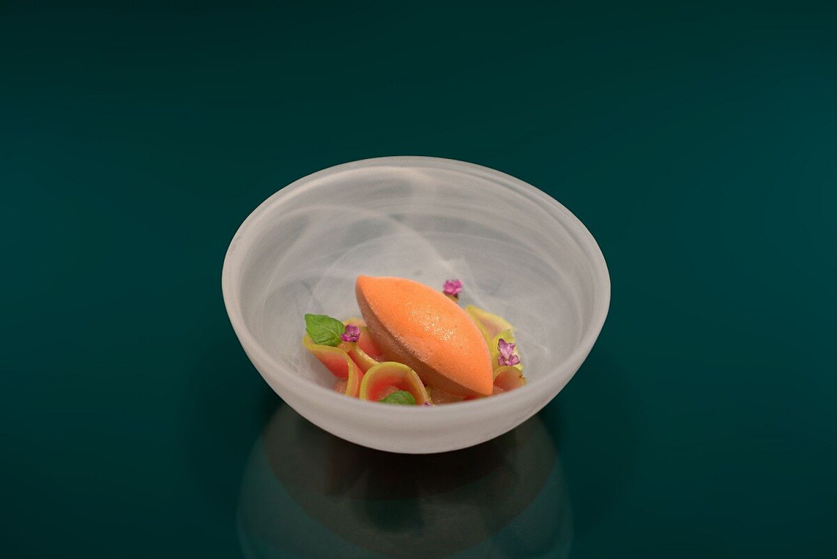 文公館在中式套餐中融入了西餐常見的「palate cleanser」,選用宜蘭紅心芭樂製成口感輕盈的雪酪,搭配微酸爽口的紫蘇酒漬紅心芭樂片與柚子凝膠,利用酸甜明亮的風味喚醒味蕾,雪酪上還加入用土芭樂嫩芯葉片提煉的調味油,讓味道更為鮮明清新。